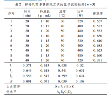 通過正交試驗確定樺褐孔菌多糖的最佳提取工藝。正交 試驗結(jié)果表明,影響樺褐孔菌多糖類物質(zhì)提取率的因素主次 順序為 D > A > B > C,即超聲功率和超聲時間對樺褐孔菌多 糖提取效果影響相對較大,其次為提取溫度、料液比的影響。 綜合以上條件,樺褐孔菌多糖的最佳提取條件為 A2B2C1D3, 即按 1 g ∶ 20 mL 的料液比在溫度 30 ℃下提取 30 min,超聲功 率為 480 W,乙醇濃度為 30% 進(jìn)行多糖含量測定( 表 2) 。 通過對正交試驗結(jié)果進(jìn)行方差分析,來分析各因素對多 糖提取率的影響。結(jié)果表明,提取時間、功率、溫度和料液比 對提取率影響顯著( 表 2) 。