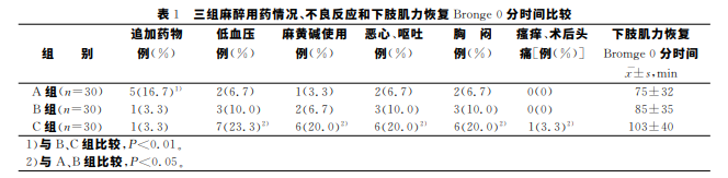 三組產婦年齡、身高、體質量、手術持續時間、補 液量和尿量比較,差異均無統計學意義,三組患者均 成功完成手術,無一例改變麻 醉 方 式。A 組 術 中 硬 膜外腔追加藥物率最高,B、C 組硬膜外 腔 追 加 藥 物 率較低(P<0.01),C 組低血壓發生率、麻黃堿使用 率、惡心嘔吐及胸悶呼吸困難等不良反應發生率與 A 和 B組比較,差異均有統計學意義(P<0.05)(見 表1)。
