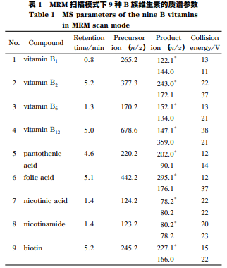 質譜應用技術中,流動相的選擇除考慮色譜的分離效果外還要考慮化合物的離子化程度,由于本 實驗選用電噴霧電離源、正離子模式,所以在流動相 中添加了甲酸。此外,有機相分別采用甲醇和乙腈 進行優化,分析各種維生素的響應強度,最終采用甲 醇作為流動相中的有機相。為了確定本實驗的 MRM 條件,依次將單一標 準品溶液(1. 0 mg / L)不經過色譜柱直接泵入質譜 中,在 ESI- 模式下,大部分維生素響應較低;在 ESI+ 模式下,9 種 B 族維生素均能獲得豐度較高的母離 子,其中鹽酸鹽、鈣鹽等都會脫去鹽后以單一分子的 狀態離子化,得到[M+H]+ 峰,維生素 B12則為多電 子物質,滿足[M+H]+ / n 規律。確定母離子后,分 別對其子離子進行二級質譜掃描,選擇豐度較高、干 擾較小的兩對子離子作為定性離子,豐度最高的離 子作為定量離子,然后優化其碰撞能量。用 0. 1% (v / v)甲酸水溶液配制標準溶液,以各 B 族維生素的峰面積為縱坐標(y)、質量濃度為橫 坐標(x,μg / L)繪制標準曲線。結果表明,9 種維 生素均具有良好的線性關系,相關系數(R2 )均大于 0. 999。以信噪比為 3 和 10 時的進樣濃度為最低檢 出含量和最低定量含量,根據樣品前處理過程,最終 計算得出該方法的檢出限為 0. 09~1. 67 μg / L。