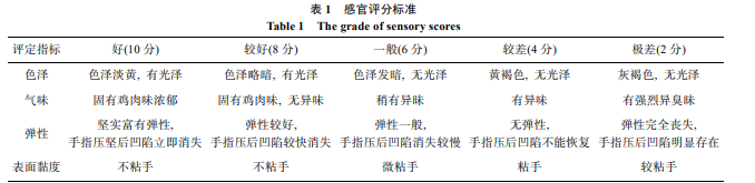 冷鮮雞的表觀狀態由 10 名專業人員評判, 評判標準 見表 1。從色澤、氣味、表面黏度和彈性 4 方面對冷鮮雞 進行評分, 然后將 4 項分值相加, 10 人評判平均值為最終 試驗結果, 最終得分 30 分以上表示一級新鮮, 20 分以上表 示二級新鮮, 8 分以下表示已經完全腐敗, 不宜食用。
